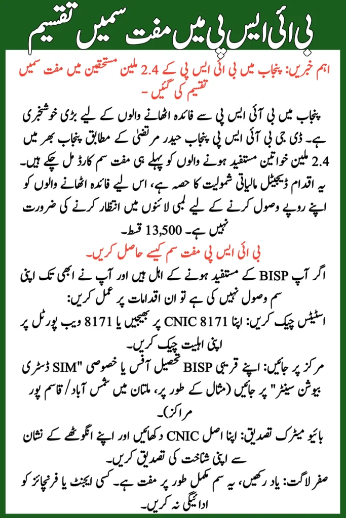 The distribution of free SIMs to 2.4 million BISP beneficiaries in Punjab is a major step toward digital financial inclusion in 2026. This initiative ensures transparency, security, and dignity for women receiving social support. By activating the free SIM and linked digital wallet, beneficiaries can receive their full payments without delays or deductions. Every eligible woman is encouraged to complete the process and rely only on official BISP channels.